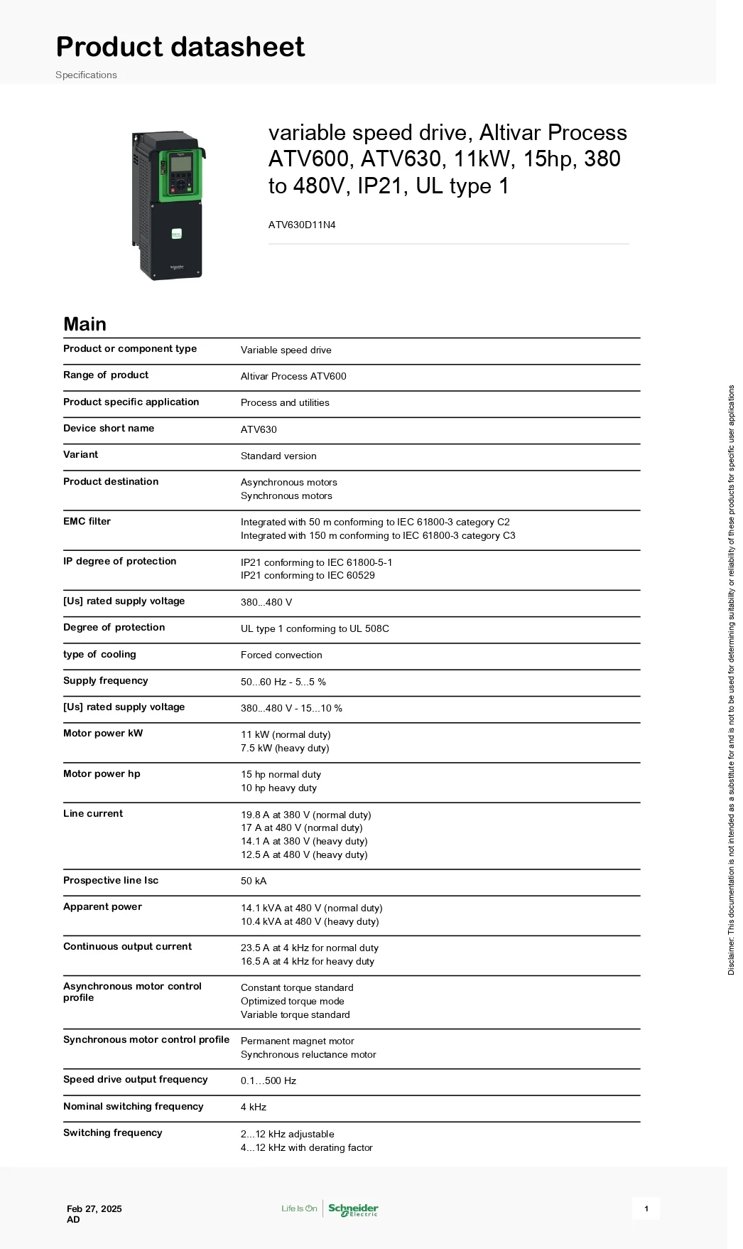 Variable speed drive, Altivar Process ATV600, ATV630, 11kW, 15hp, 380 to 480V, IP21, UL type 1