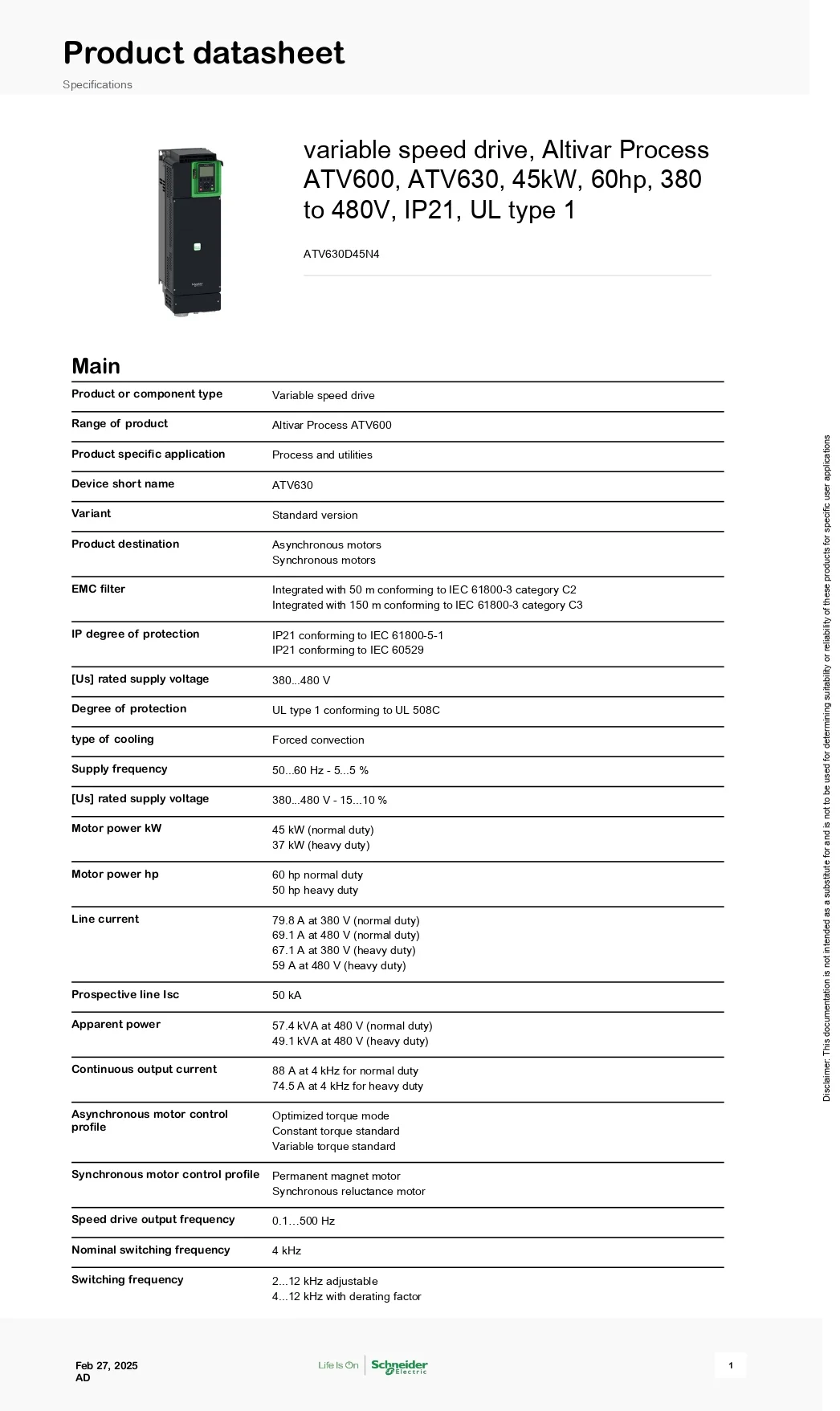 Variable speed drive, Altivar Process ATV600, ATV630, 45kW, 60hp, 380 to 480V, IP21, UL type 1