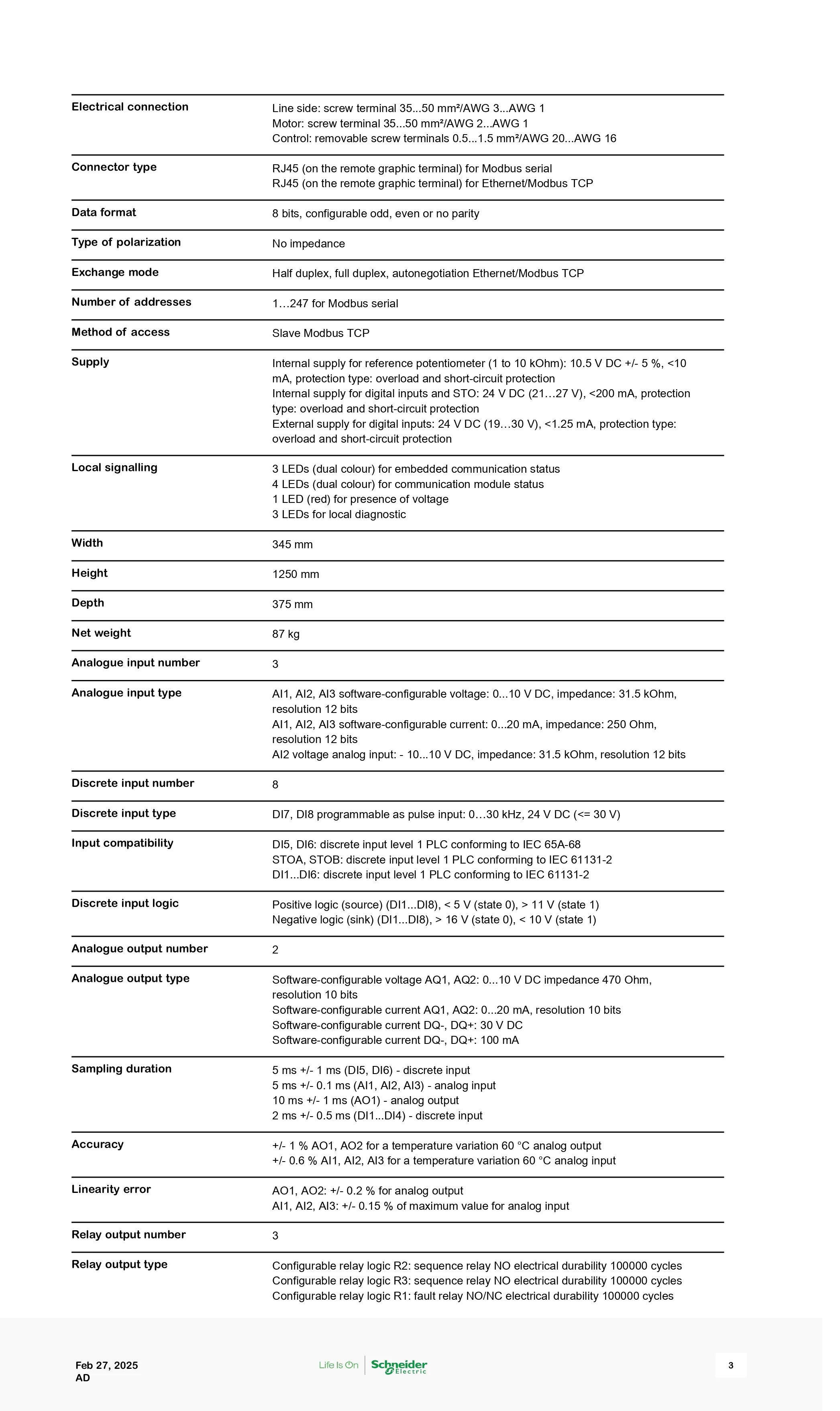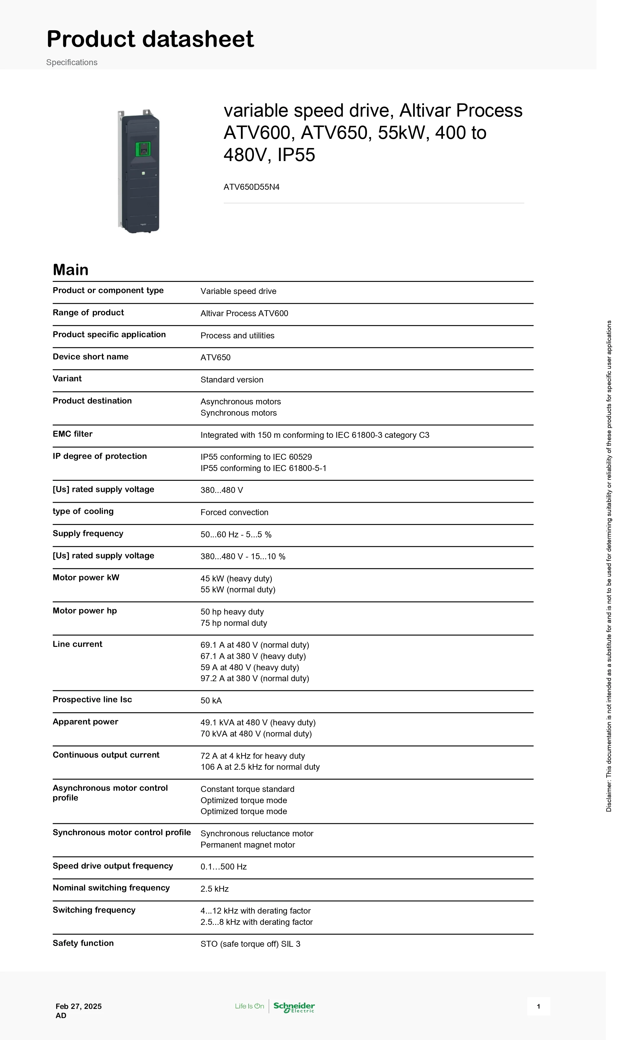 Variable speed drive, Altivar Process ATV600, ATV650, 55kW, 400 to 480V, IP55